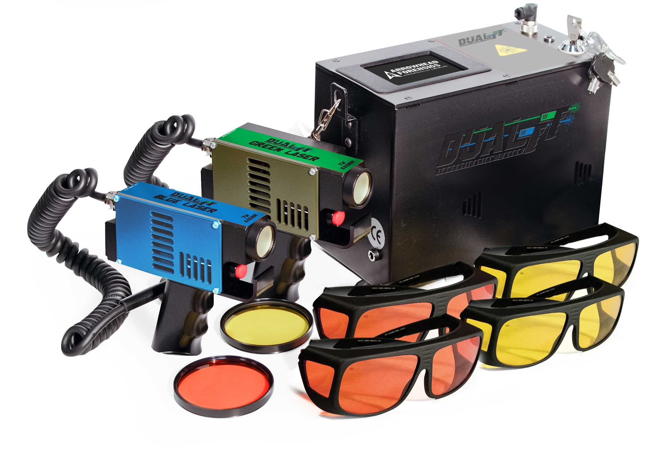 The Dual77 445nm/520nm Pistol Grip Investigation laser system is used to detect latent fingerprints and other evidence, such as bone fragments, footprints, bodily fluids, chemically treated prints, and more. During fluorescence examination the investigator scans the diverging laser beam slowly across a surface. The laser operates at a wavelength of 445 nm or at 520 nm with a maximum radiant power of 7 watts. The Dual77’s compact, lightweight design makes this a truly portable laser for both the scene and the lab.